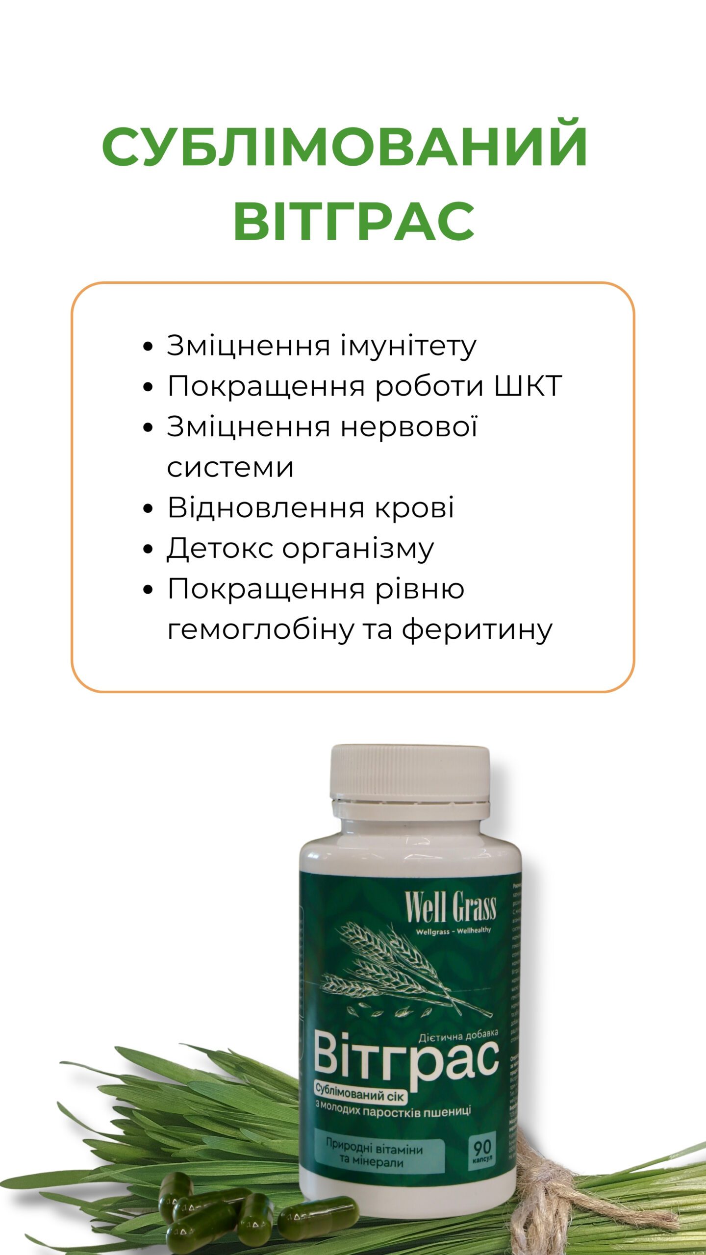 Сублімований вітграс у капсулах — це концентрат соку молодих паростків пшениці, висушений методом сублімації, який зберігає до 95% користі свіжого соку 100% натуральний продукт без домішок і консервантів